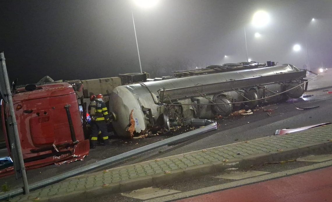 Polițiștii rutieri giurgiuveni efectuează cercetări după ce o autocisternă încărcată cu amoniac s-a răsturnat în noaptea de marți spre miercuri pe DN 5, Giurgiu-București, traficul în zonă fiind restricționat până la repunerea autotrenului pe roți.